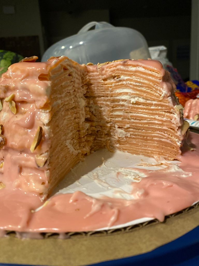 This month was really fun because I was visiting Tiffany again, and we were able to bake together. It’s always better with a friend. We made a strawberry cheesecake this month, but this cheesecake had two sponges – one on the top and one on the bottom. We actually got this recipe from a Facebook post in a baking group, and the post directed us to an Instagram account. I don’t have the link for it, unfortunately. The cheesecake consisted of Genoise sponges, strawberry jelly, and a cream cheese filling. It was pretty good, but I’d rather have the cream roll from February hands down.