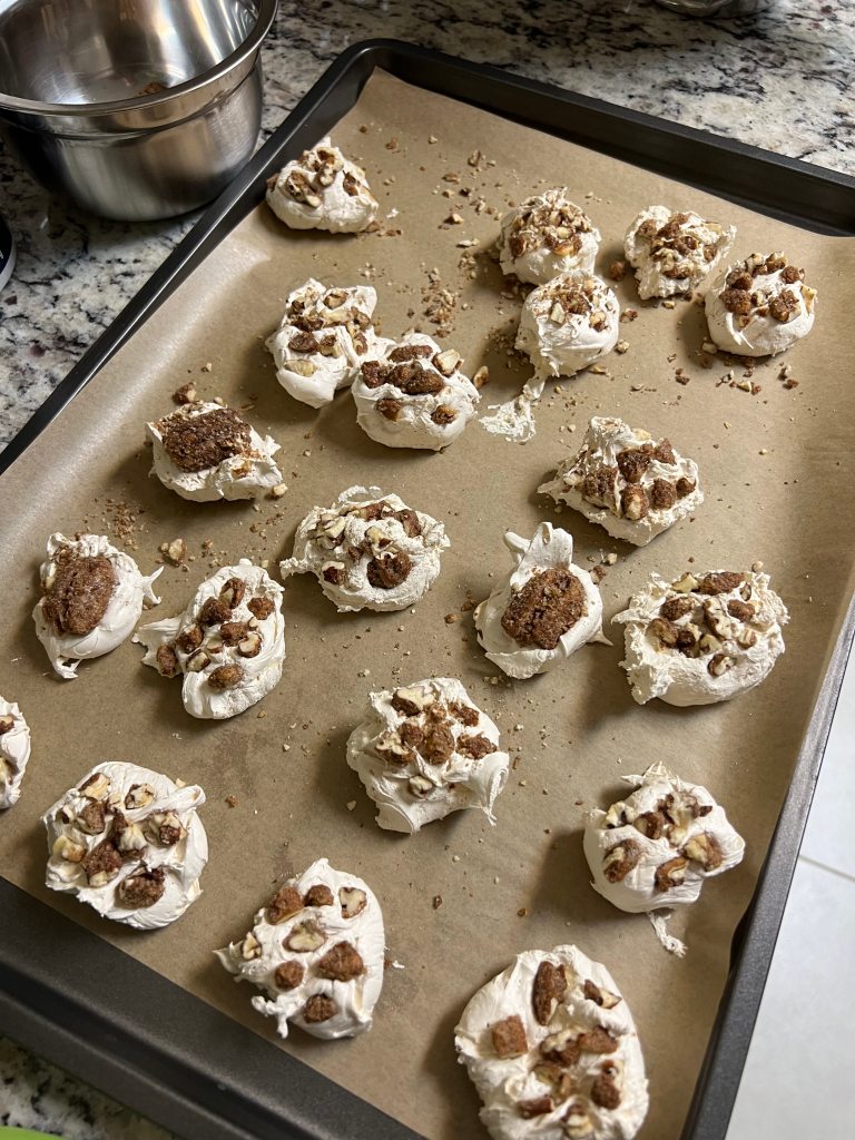Three cheers for October! I was visiting Tiffany, and we got to bake together again for the last time this year. And I’m so glad we did because this month, we made divinity candy. I had never made candy, but Tiffany was prepared with a candy thermometer (which is pretty important for making candy). Divinity was not particularly difficult, but the sticky candy syrup made a mess. It was a workout for her stand mixer to mix the divinity long enough to drop it onto wax paper and keep its shape, too. It was obnoxious to clean the dishes afterward with all the gooey mess. All that being said, it was delicious and the first time I had really tried divinity. I would definitely make it again on a day I’m mentally prepared to deal with the fallout.